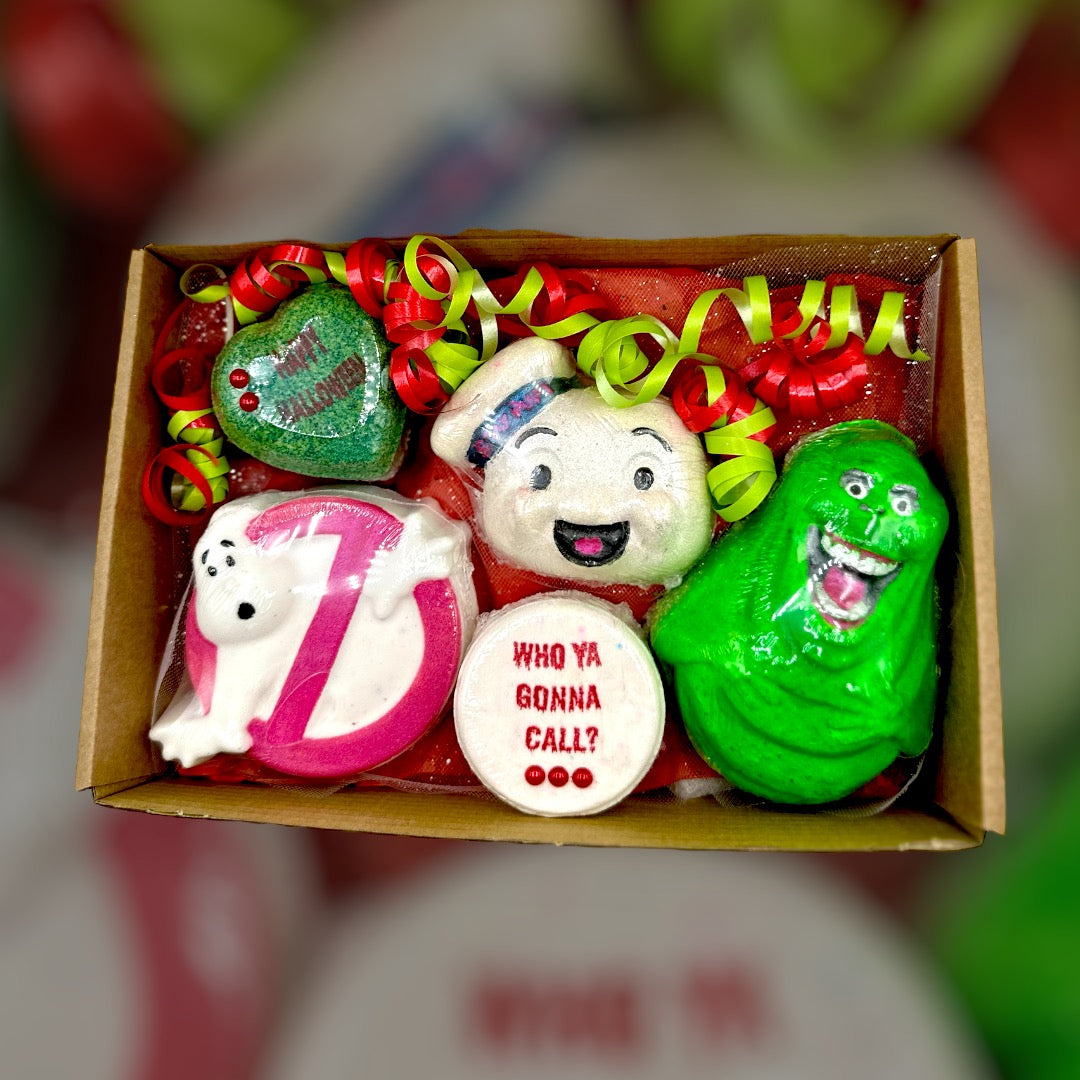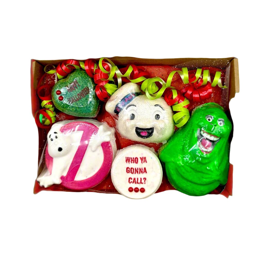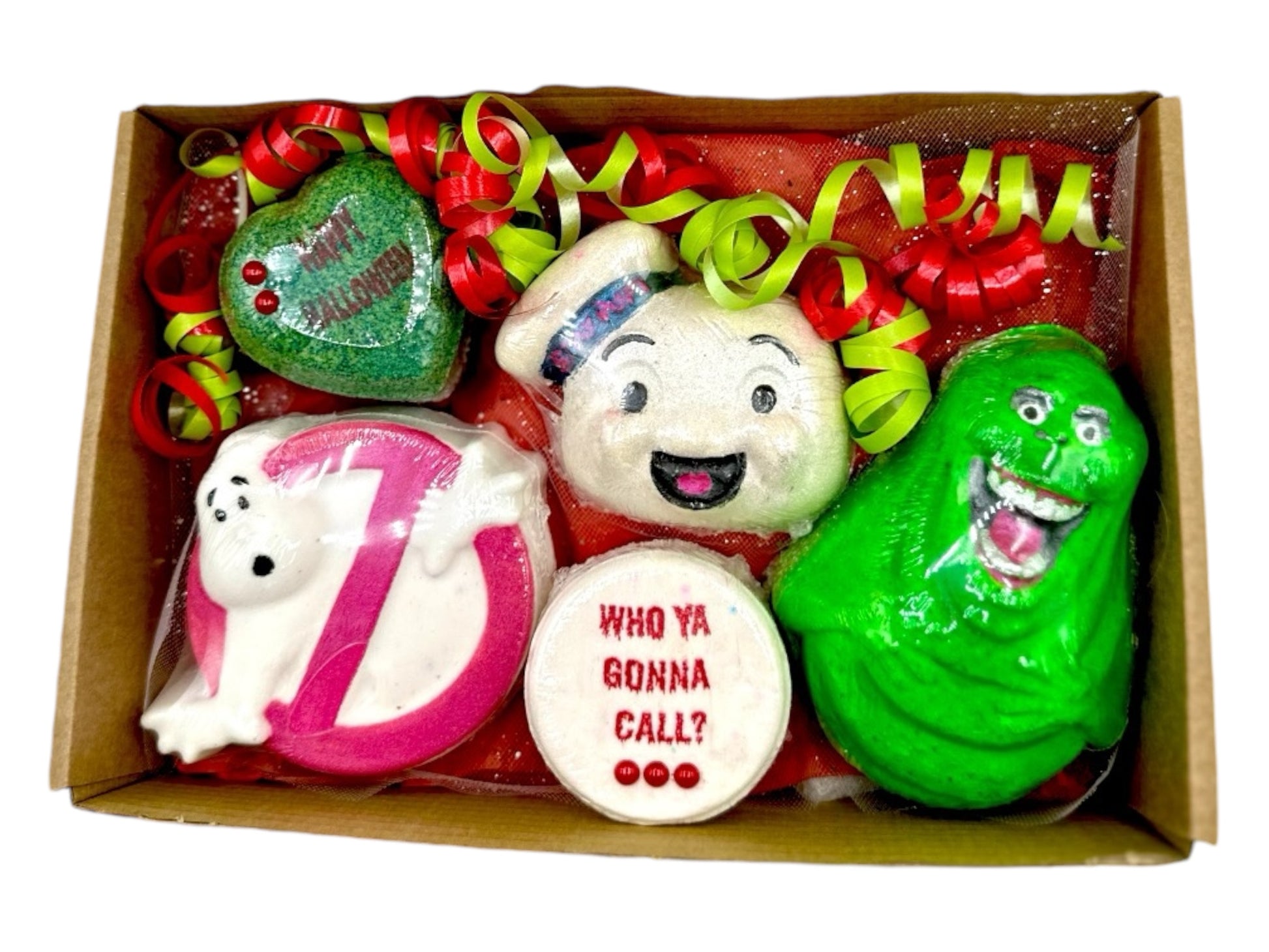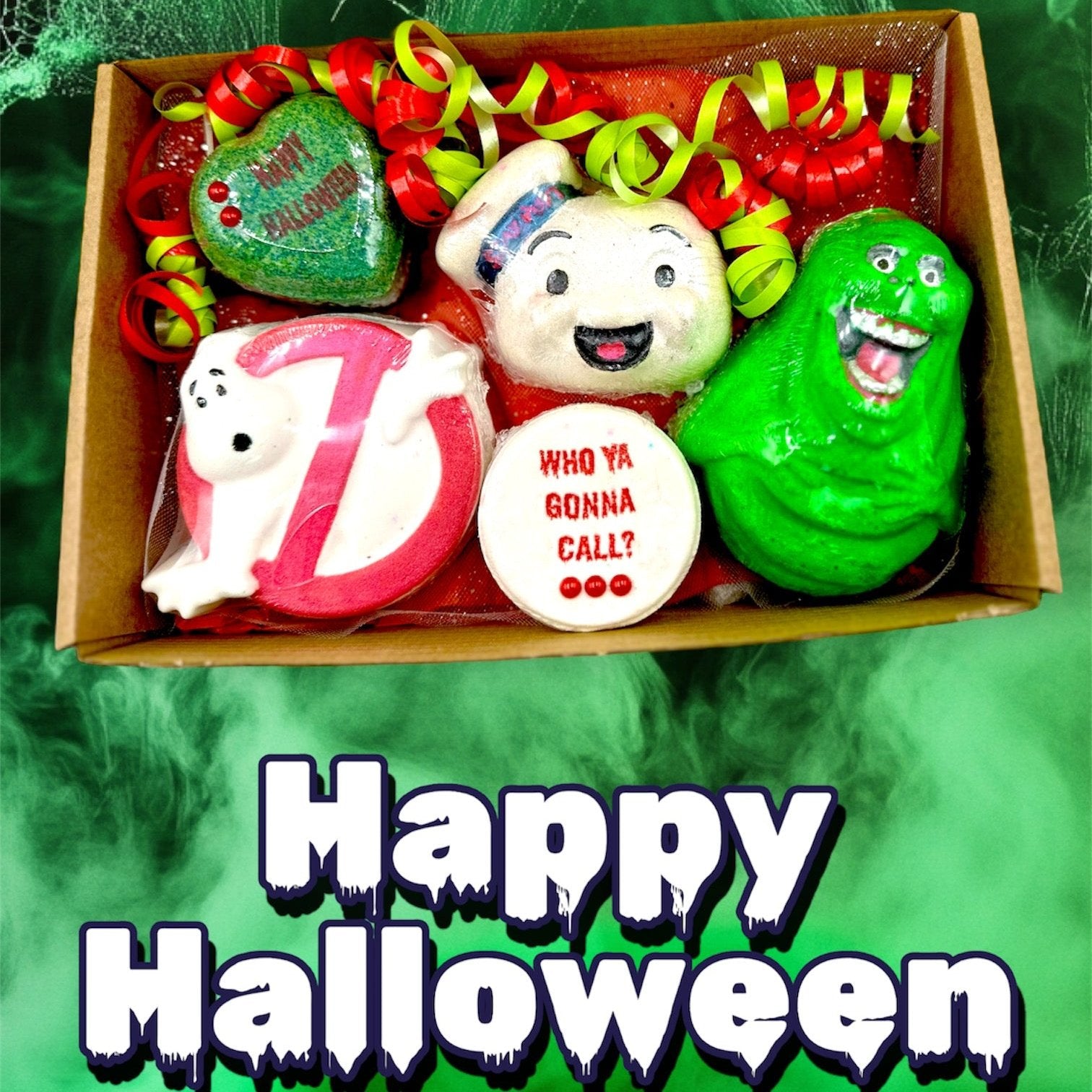 Gift set contains a slimer bath bomb, a Stay Puft bath bomb, a bath bomb, who ya gonna call bath bomb and a Happy Halloween bath bomb. All hand painted. A name can be added to the bomb or a custom message.