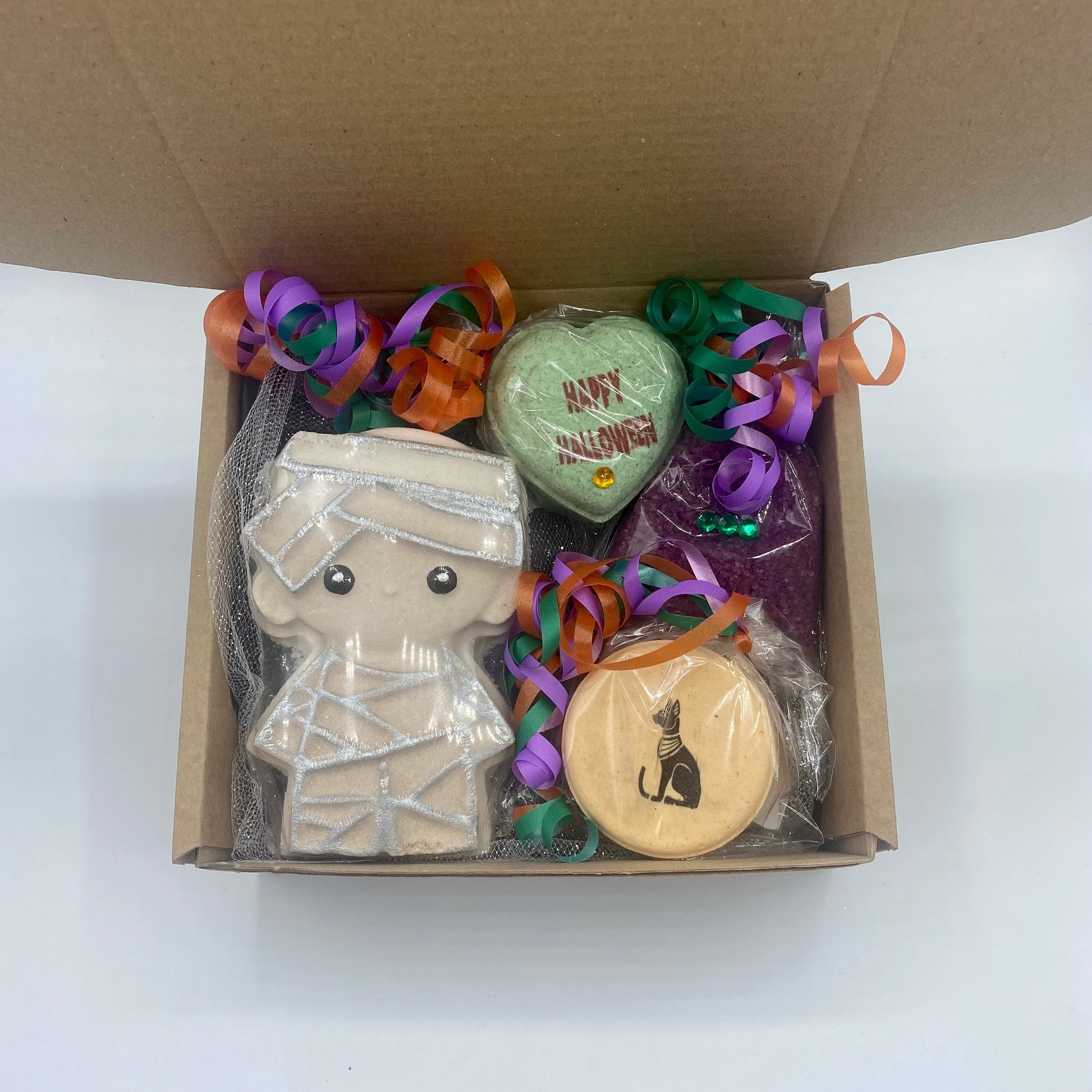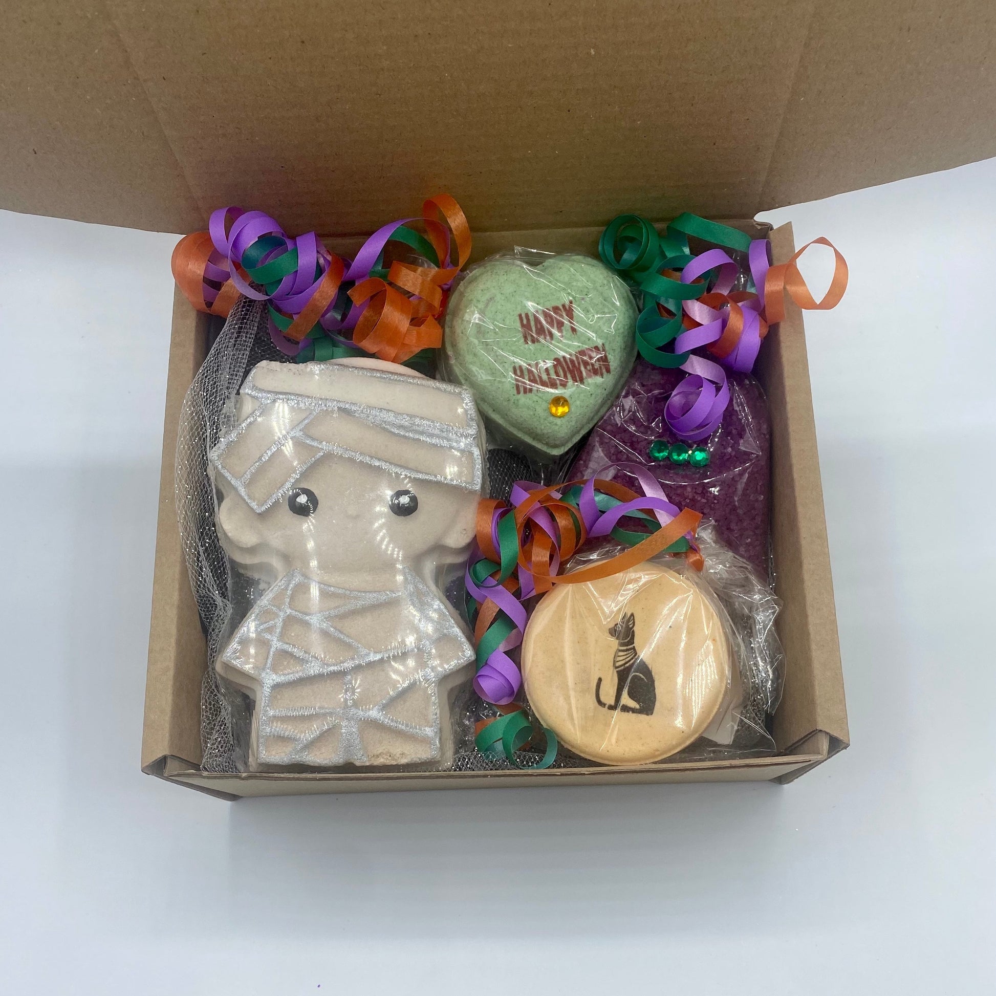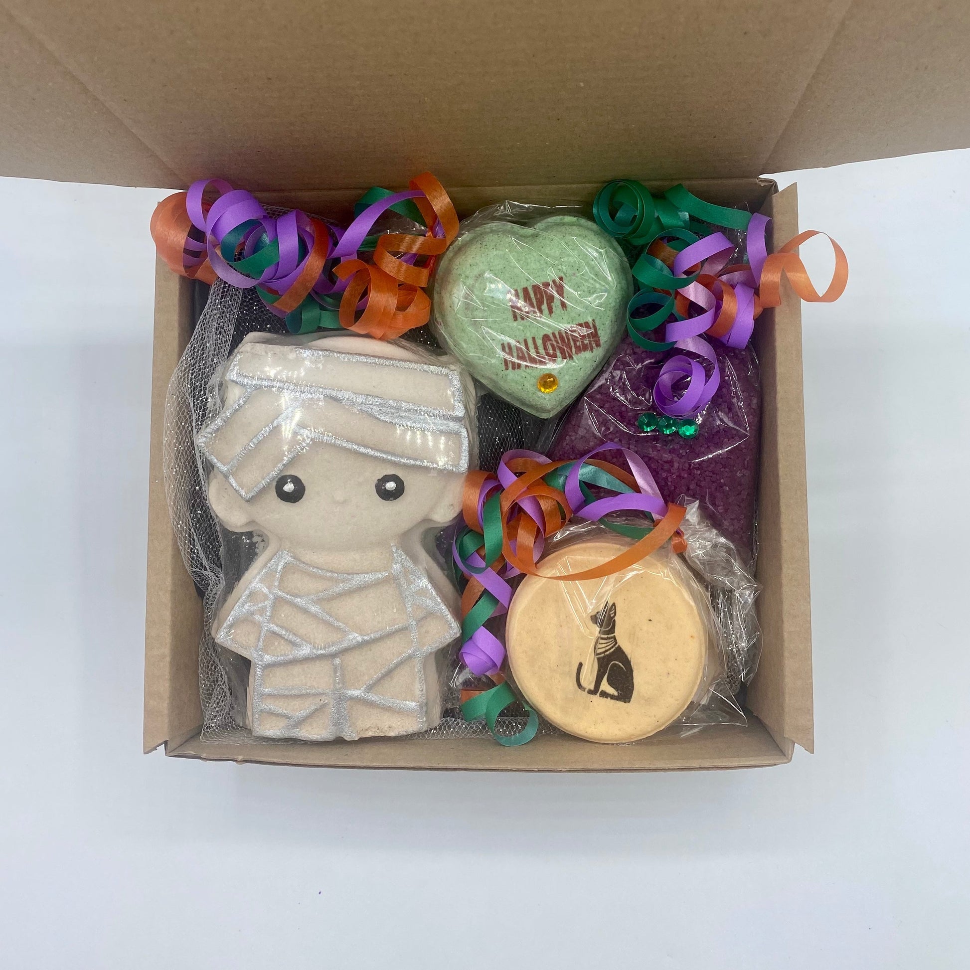 This set contains a large Mummy bath bomb, an Egyptian cat print bath bomb puck, some aromatherapy bath salts potion and a ‘Happy Halloween’ bomb which can be upgraded to include a name or your own custom message.