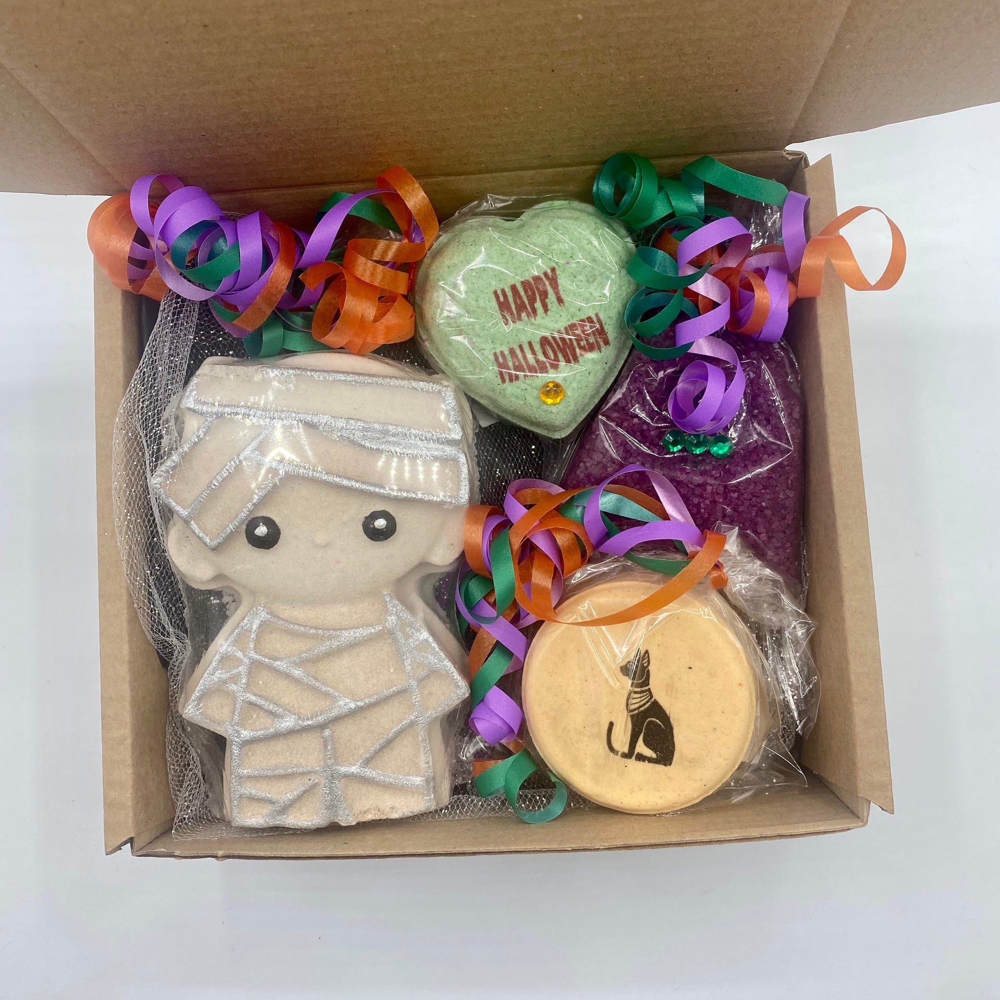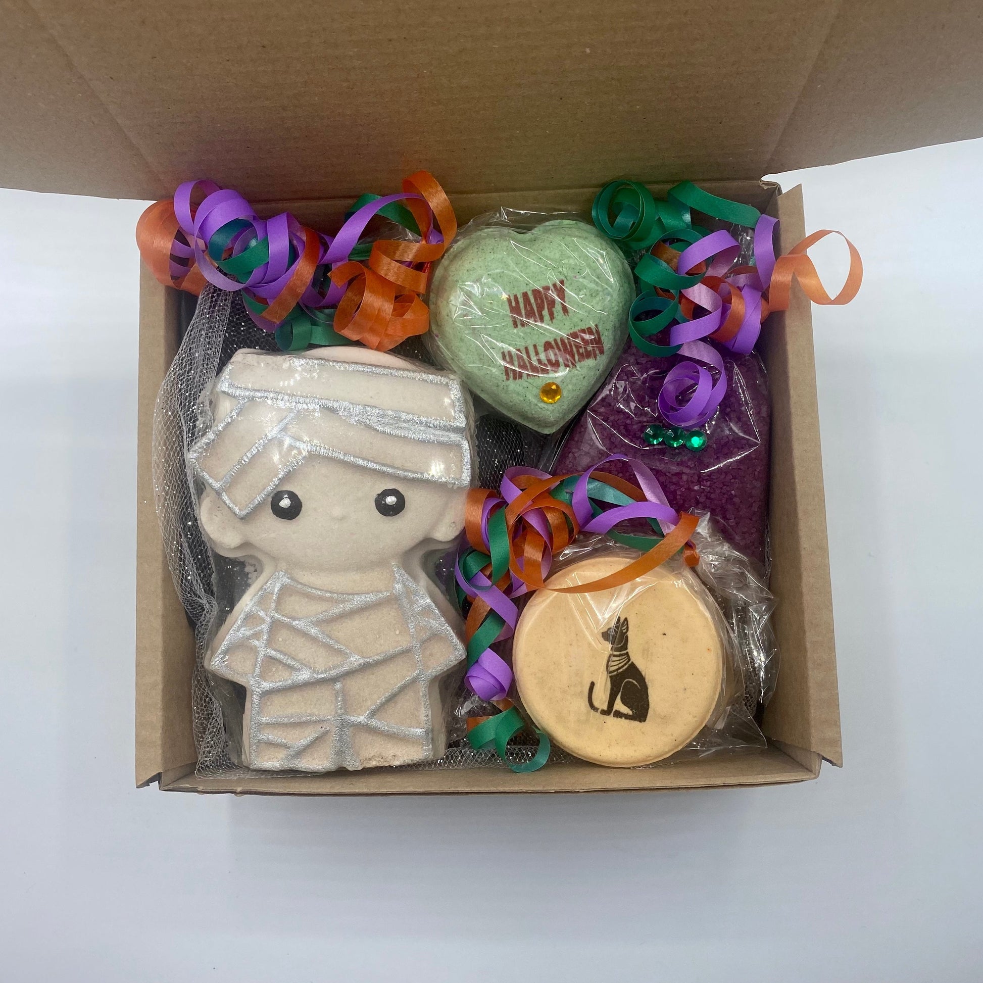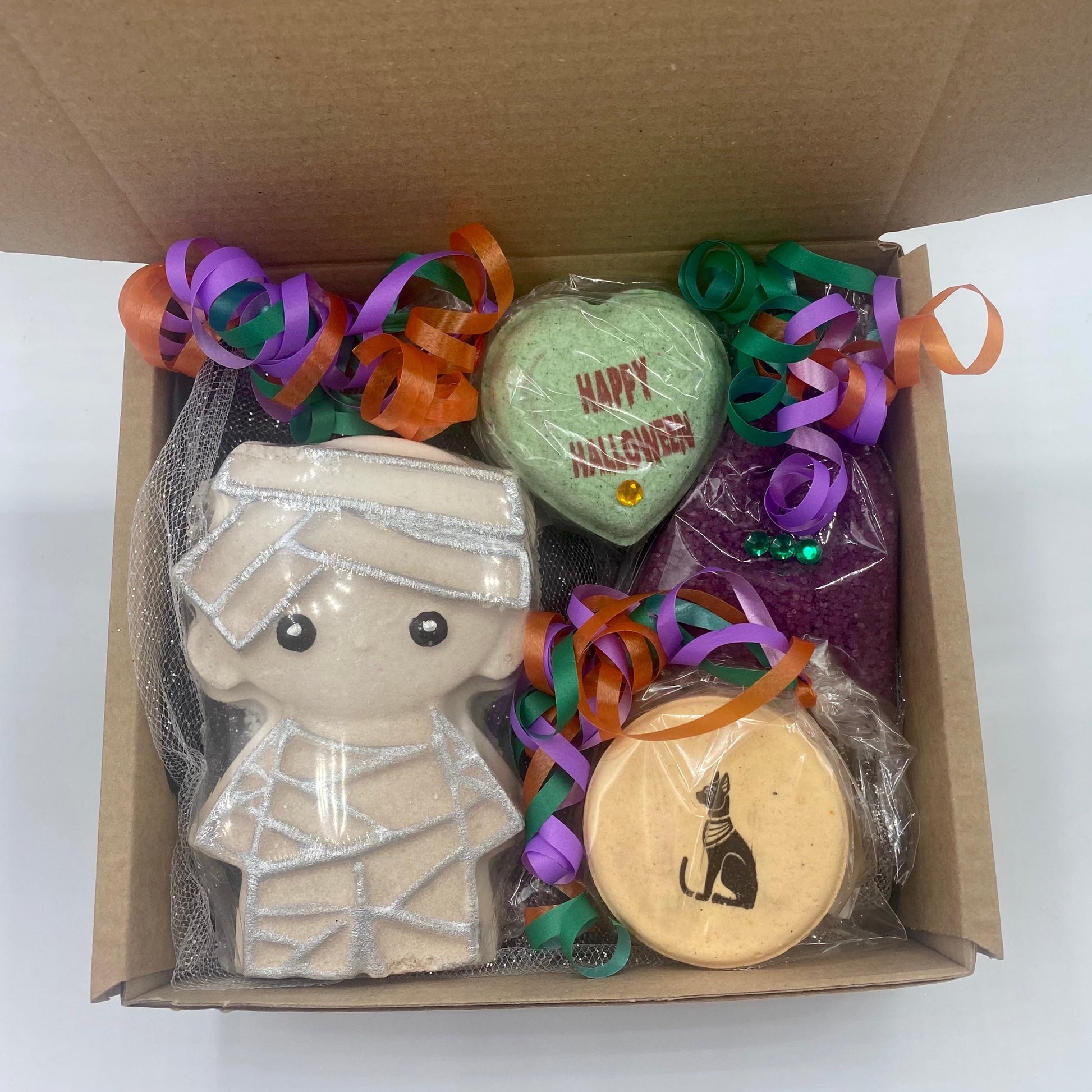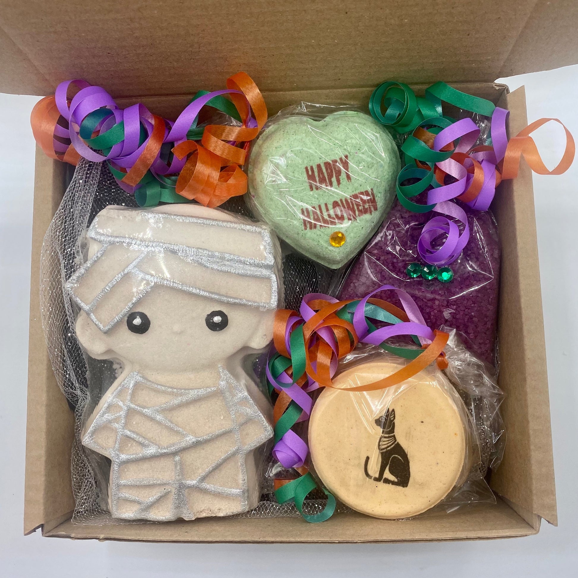 This set contains a large Mummy bath bomb, an Egyptian cat print bath bomb puck, some aromatherapy bath salts potion and a ‘Happy Halloween’ bomb which can be upgraded to include a name or your own custom message.